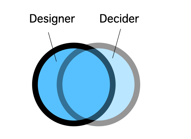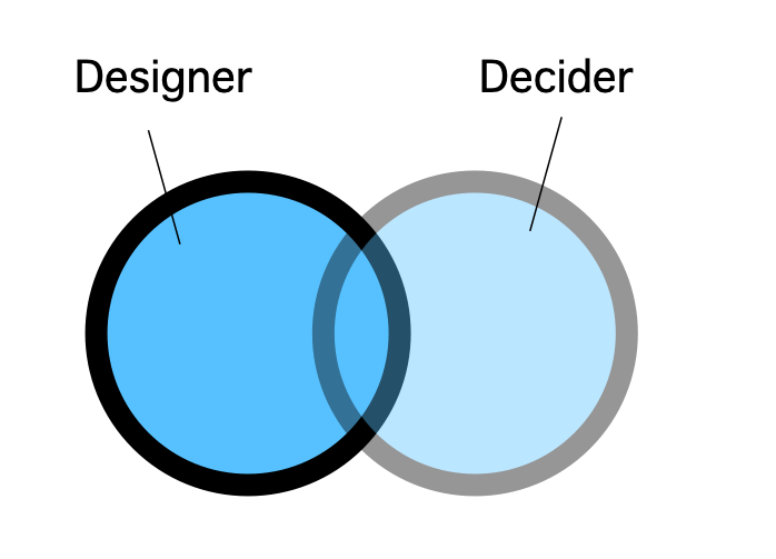 Somehow we have forgotten that we have internalized defining designing as separate from the act of deciding. What we call designing is mostly advising. We make things as suggestions for other powerful people, clients, executives, project teams, and they make the decisions. What we do get to decide are often the details. We work hard to offer good advice but that advice is often ignored. This means the true designers of a product are not the people with the job title designer, but the leaders who decide the strategy, make plans, choose staff and prioritize budgets, people we often fear or avoid, to our own disempowerment. We consider all these things as not-design, and in some ways beneath us, even though we depend on them in order to do the design work we want to do. As Maxim Leyzerovich cynically described: “being a designer is mostly just making people feel good about decisions that have already been made.” But what would it mean to be a designer who is also the decider?