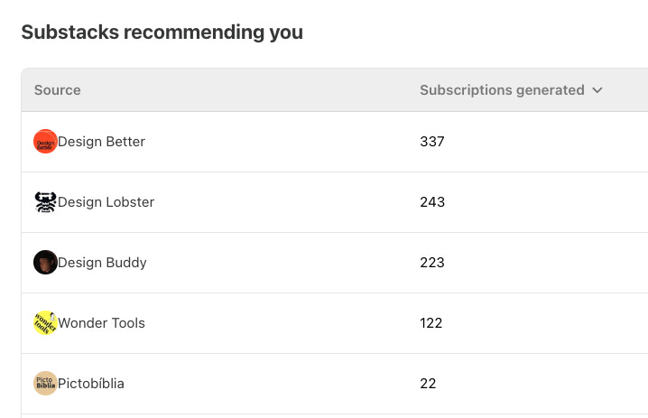 Many of you have shared posts and recommended this list. Thank you! From the data Substack gives me, it seems the biggest boost to new subscribers is other Substacks. Almost 1/3rd of all subscriptions here came from these recommendations and I’m grateful to them.