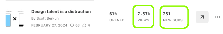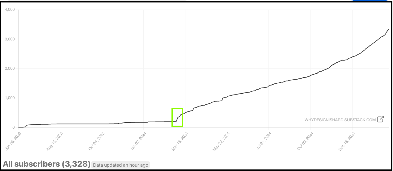 The first big spike in subscribers came when I reposted my Feb 27th, 2024 post Design Talent is Distraction to LinkedIn. It got picked up by some other well known UX folks, including Peter Merholz who has a large following there, and the trajectory changed (see chart below). I posted weekly before and after, but this shift made me pay more attention to LinkedIn, where my own following has grown since. I had about 4,000 followers before all this, and now it’s closer to 7,000.